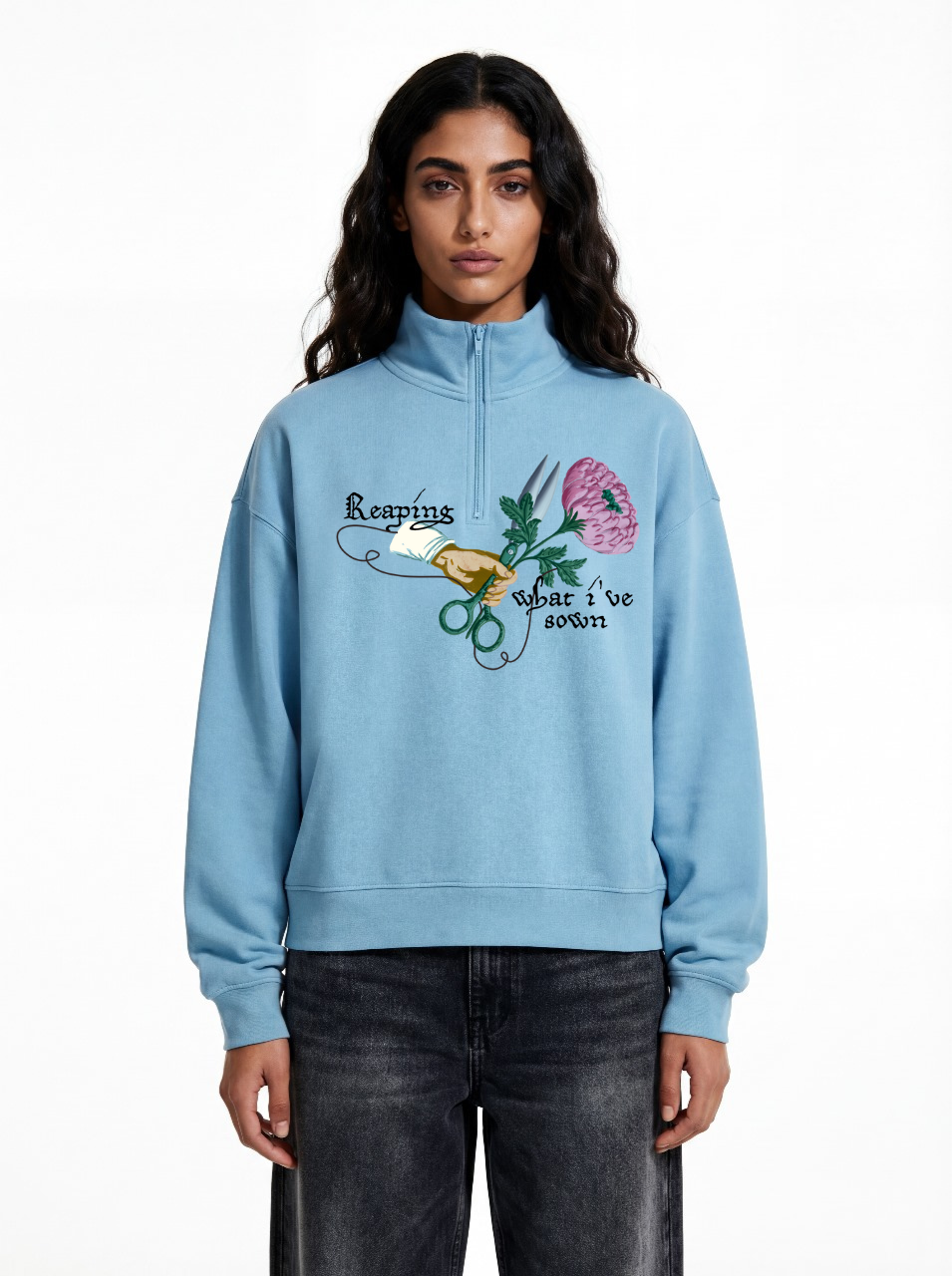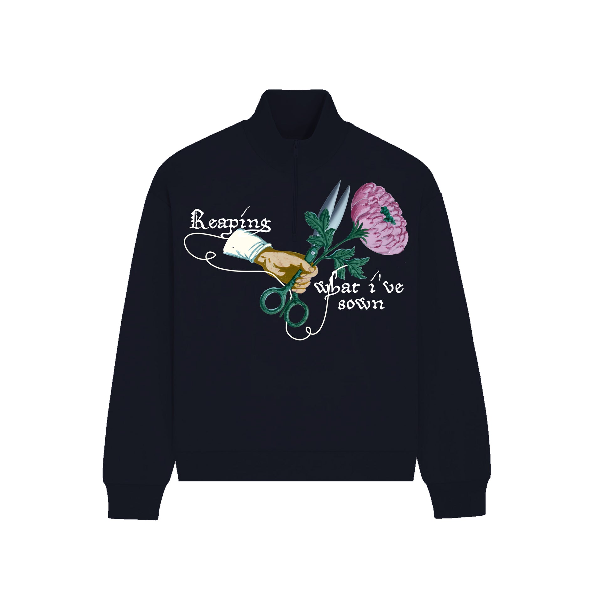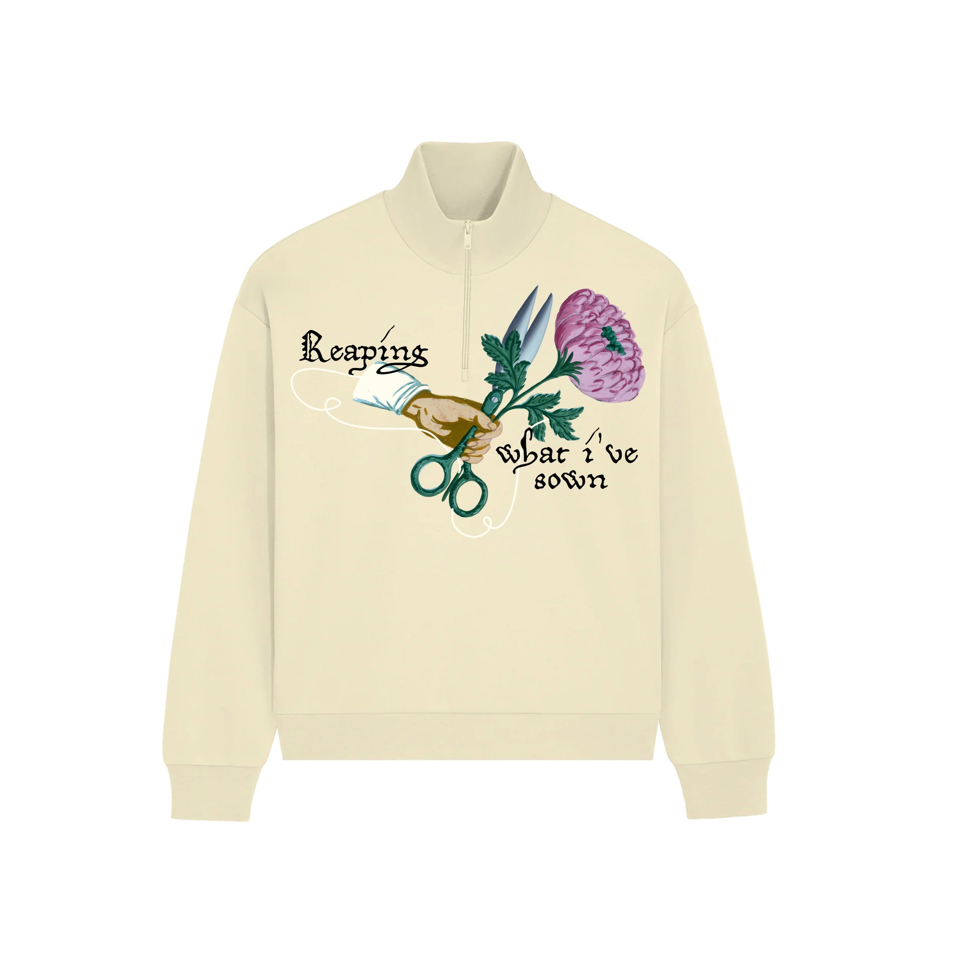This quarter zip sweatshirt features graphic artwork on the front, and the back is plain.