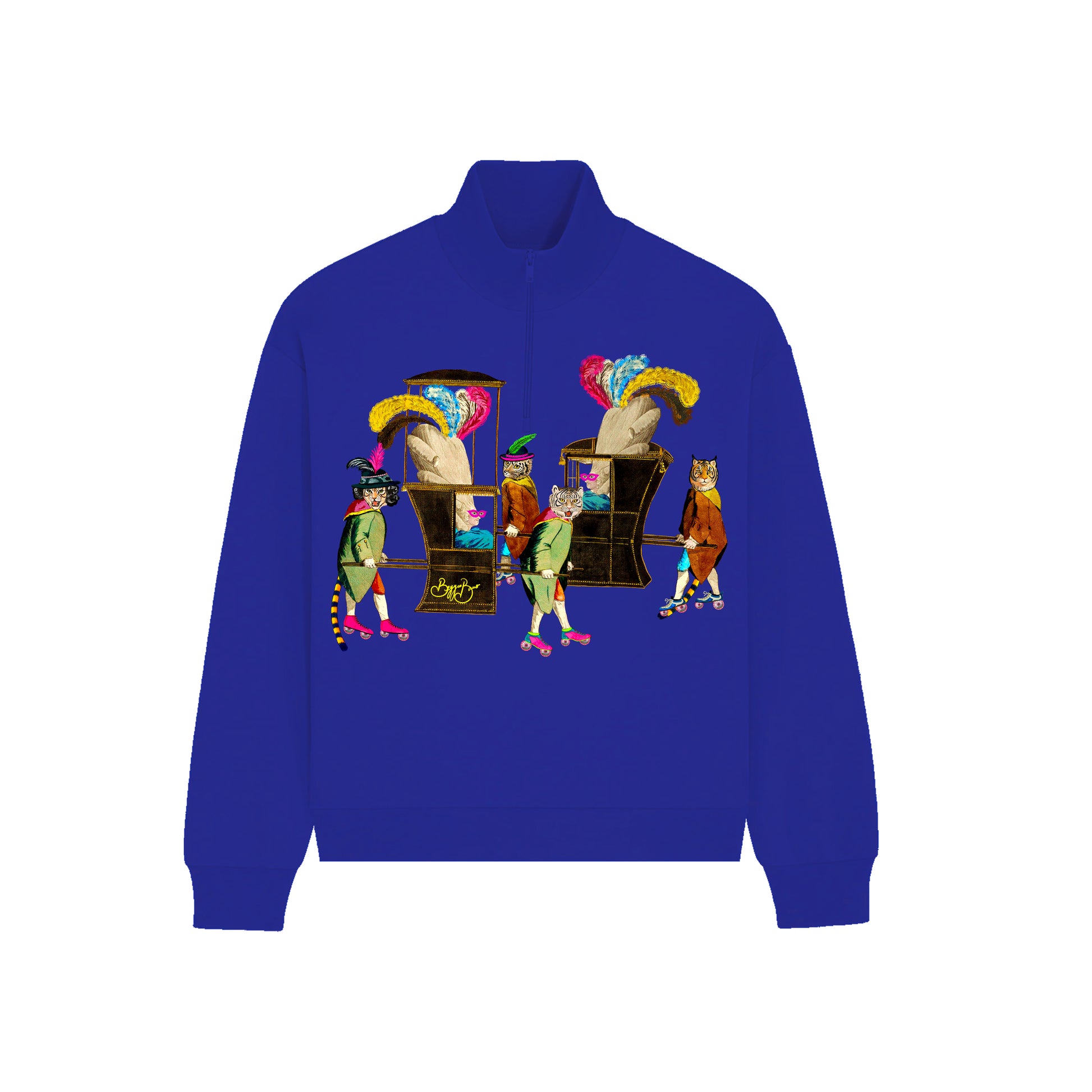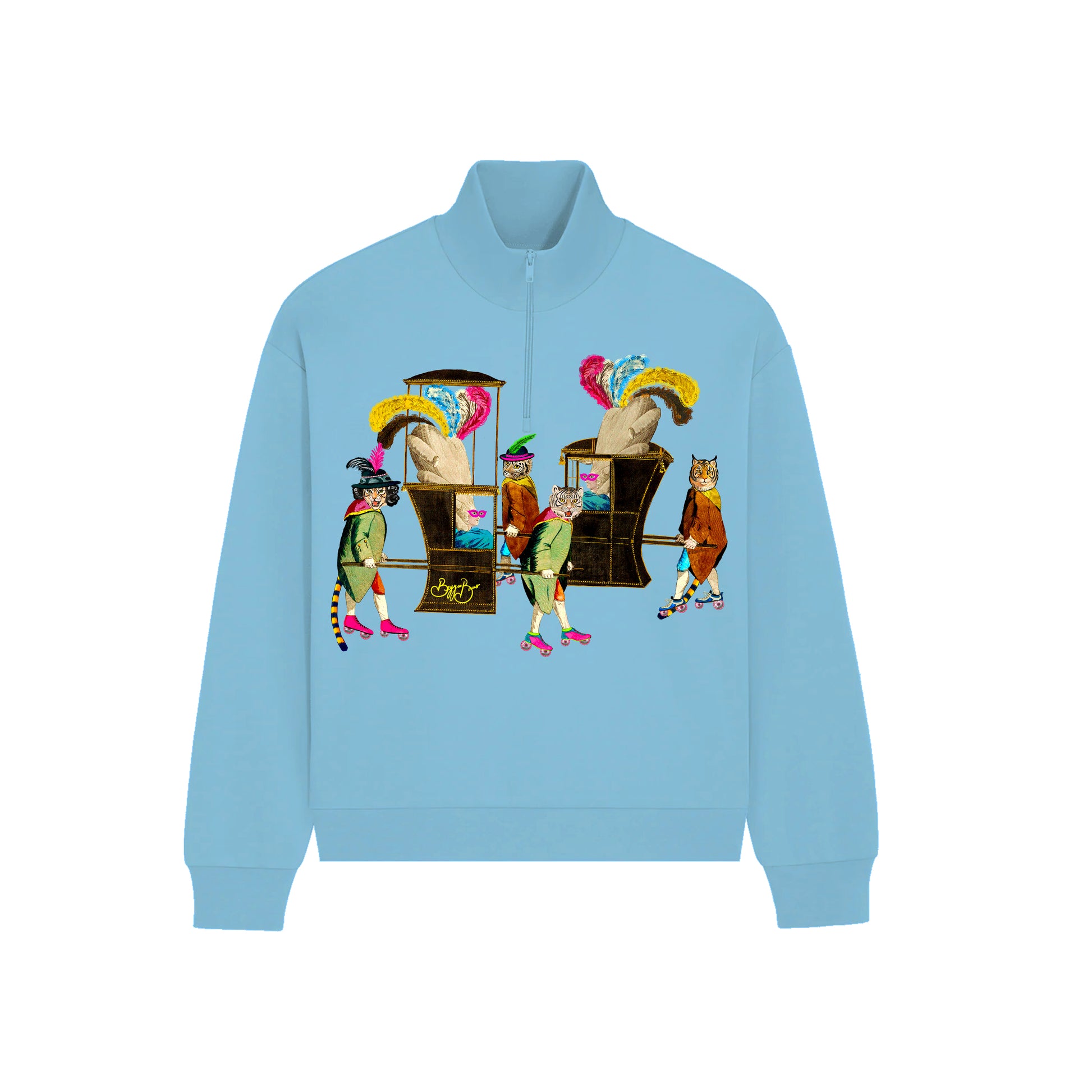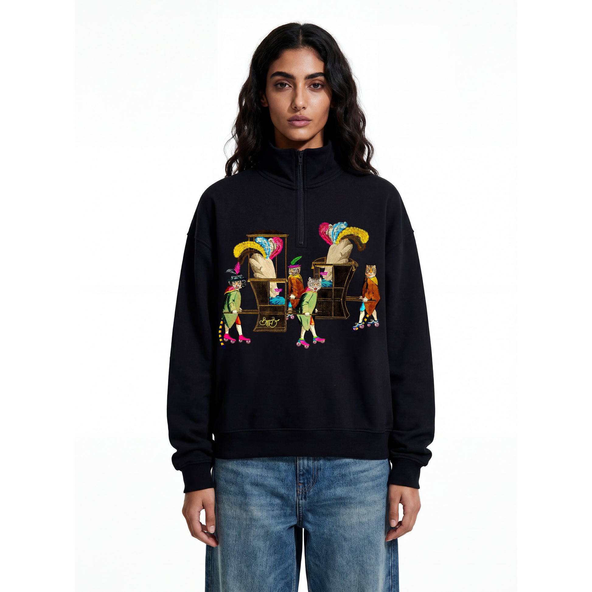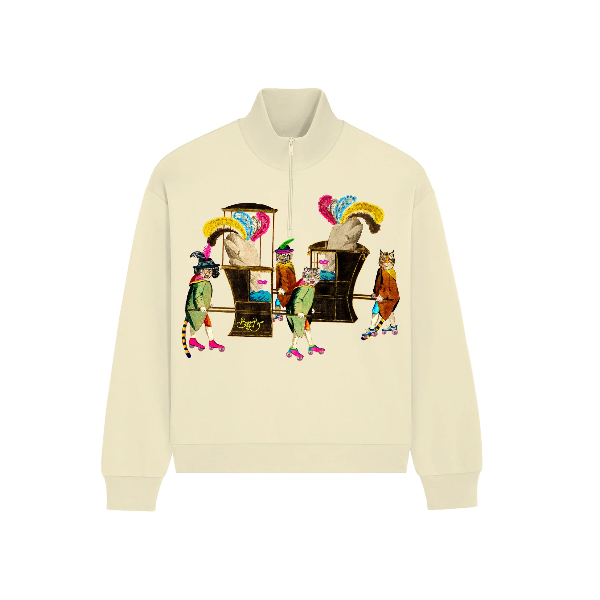 This quarter zip sweatshirt features graphic artwork on the front, and the back is plain.